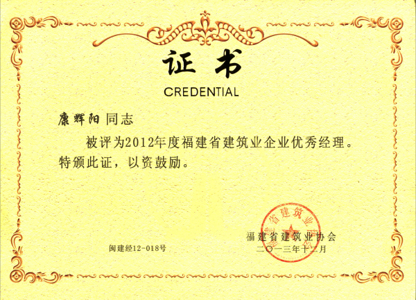康輝陽(yáng)同志2012年度福建省建筑業(yè)企業(yè)優(yōu)秀經(jīng)理