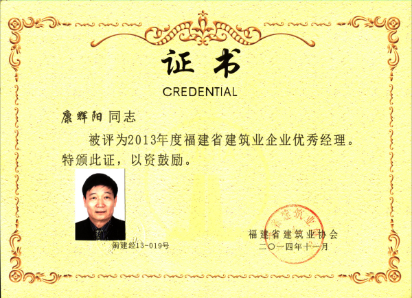 康輝陽(yáng)同志2013年度福建省建筑業(yè)企業(yè)優(yōu)秀經(jīng)理